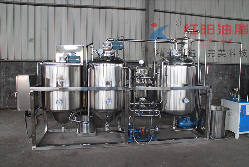 主要配套設(shè)備:中和鍋(用于酸練、堿練和水洗)、脫色鍋(用于漂白油脂及脫除色素)、脫臭鍋(用于脫去油脂臭味)、導(dǎo)熱油爐爐(提供生產(chǎn)所需熱能,溫度達(dá)到280度)、真空泵(提供脫色、脫臭所需真空)、空壓機(jī)(吹干脫色白土,壓出成品油)、過(guò)濾機(jī)(過(guò)濾白土)、蒸汽發(fā)生器(產(chǎn)生脫臭蒸餾所需蒸汽)。